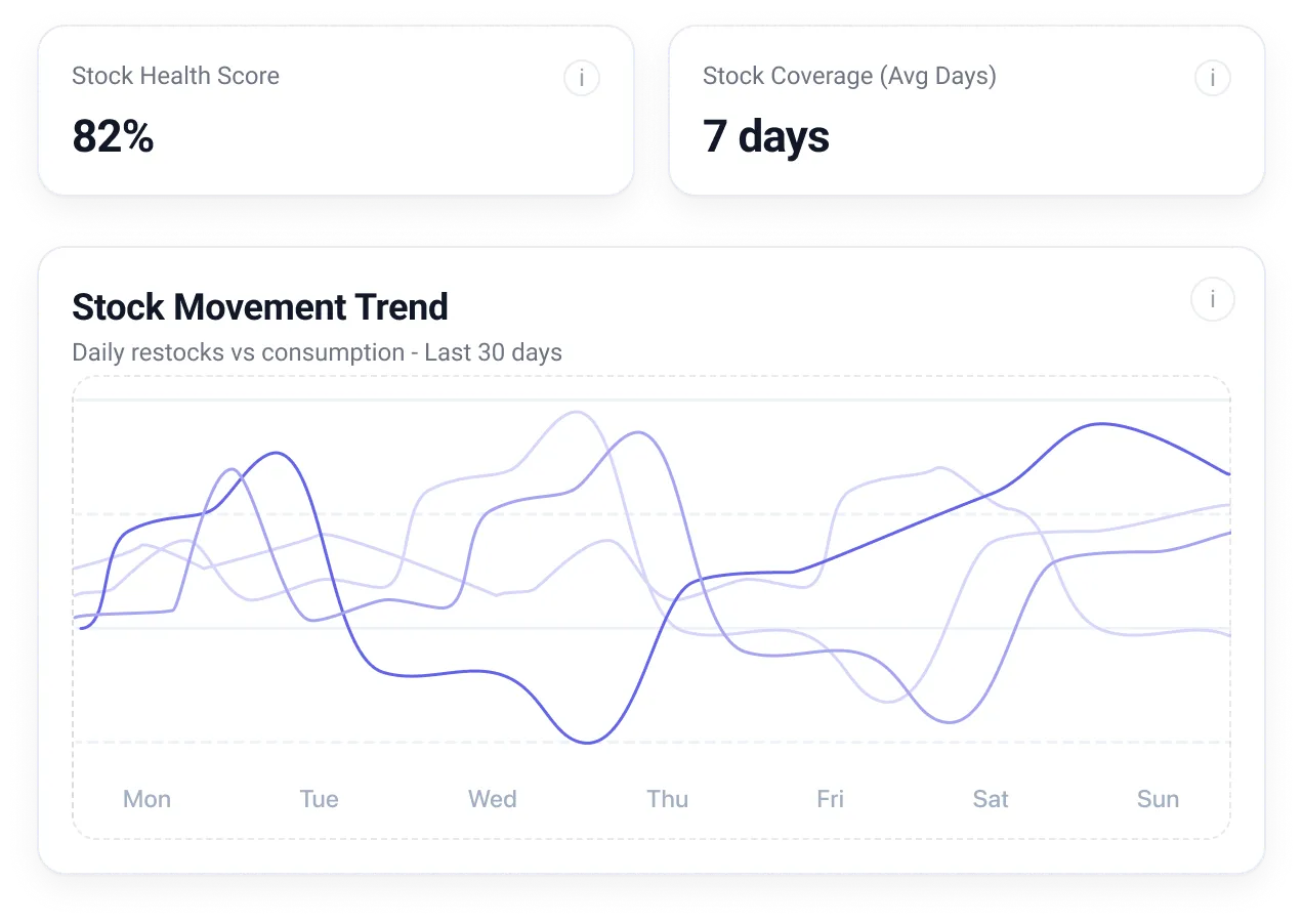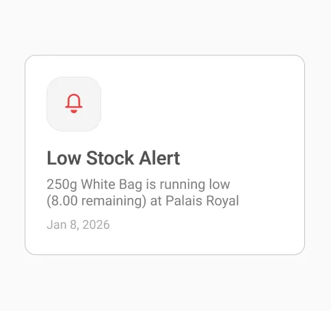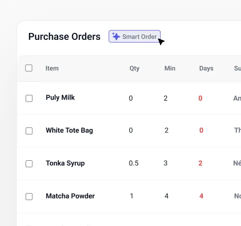 Stash analyzes your sales history, consumption patterns, and seasonality to predict what you'll need and when. It automatically suggests reorder quantities and alerts you before you run out — no spreadsheets or guesswork involved.